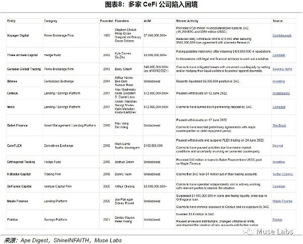 在這次UST崩潰以及其引發的連鎖反應事件中受影響較大的CeFi公司如下圖所示。