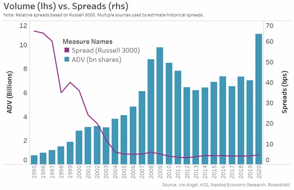 2005年,證券市場的點差在過去十年中下降了90%,且隨著成本下降,交易活動和流動性也增加了十倍。ADV(Adjusted Volume)也從1995年的0.8 billion Shares上升到2005年的4.1 billion Shares,增長了約5倍,并接下來在2009年達到階段頂峰的9.8 billion Shares,增長了約為12倍。
