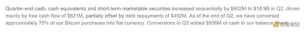 值得注意的是,二季度特斯拉已將所持大約75%的比特幣兌換成法定貨幣,單枚比特幣的出售均價約為29000美元,因此其資產負債表增加了9.36億美元的現金。