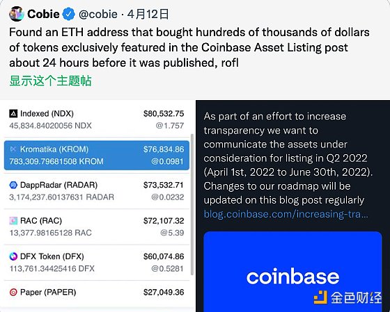 此事在2022年4月就已被提及,推特KOL Cobie在其推文中表示,在一次Coinbase上幣前,發現了在代幣上線前大約 24 小時,出現了一個購買了數十萬美元代幣的 ETH 地址,該地址僅在 Coinbase 資產清單中出現。