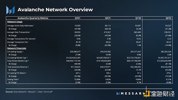 與上一季度相比,Avalanche 的網絡使用率和財務業績全面下滑,這是一年多來的首次。雖然市值急劇下降(-81.7%),但該網絡的使用量和創收并沒有出現大幅下降。日均交易量減少三分之一(-37.8%),總收入下降 25%,市銷率(P/S)逆轉,價格與收入之比從 91 倍增長至 379 倍。