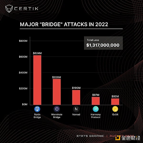 XRP/HKD-0.33%2022年自年初至今,僅5次的跨鏈橋攻擊就導致了13.17億美元的損失——這個數字是2022年Web3.0行業因黑客、欺詐、漏洞等事件造成總資產損失金額的57%。