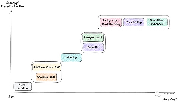 中間部分是StarkEx和Arbitrum Nova的DAC方案、zkPorter的Guardians驗證者集方案,以及通用化的Celestia和Polygon Avail方案。筆者認為采用zkPorter采用Guardians作為驗證者集,對比DAC來說安全性/去中心化程度稍高;而DA-Specific區塊鏈的方案對比一組驗證者集又要稍高。與此同時Gas花費也相應增加。當然這只是極粗略的比較。