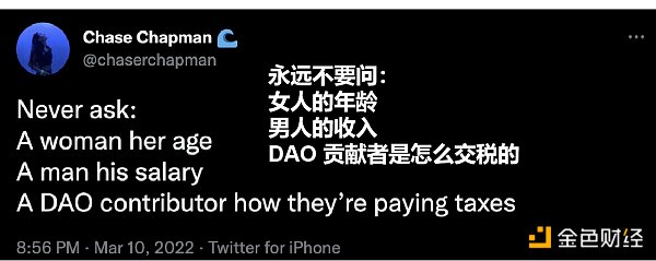 稅務問題會關聯到如何對 DAO 進行法律包裝的問題,這話題引起不了任何人的興趣,但是又對貢獻者的財產安全很關鍵。