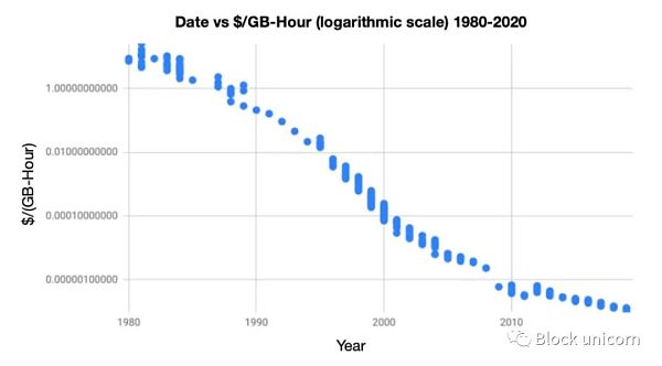 Arweave尋求以去中心化的方式提供永久數據存儲,只需一次性付費,這是通過 Arweave 捐贈機制完成的。考慮到數據存儲的成本在過去50年里以每年30.5%的速度下降,Arweave認為今天每GB/1美元的存儲購買力比未來每GB/1美元的存儲成本更高。這個三角洲使Arweave的捐贈池成為可能,“本金”是用戶支付的前期費用,“利息”是購買力隨著時間推移代幣價格的上漲。Arweave的保守假設是存儲價格每年下降0.5%,這使得捐贈池能夠長期生存。