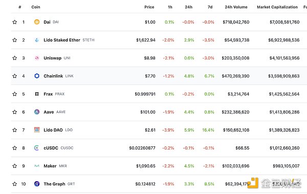 DeFi項目鎖定資產前十排名及鎖倉量 數據來源:defillama