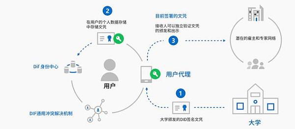 一個應用場景:愛麗絲(Alice)最近剛大學畢業。她有一份學校頒布的針對DID的畢業證書電子副本。她可以選擇向任何人(如潛在的雇主)出示文憑,他們可以獨立地核實文憑發行時間及其狀態。