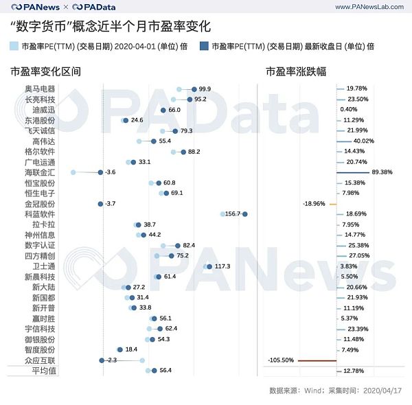 受多重利好消息刺激,除了“數字貨幣”概念股的股價在近期不斷攀升外,其估值也在上漲。根據統計,4月1日至4月16日期間,27只“數字貨幣”概念股的市盈率(每股股價與每股收益的比率)從平均49.3倍上漲至平均56.4倍,漲幅達到12.78%。