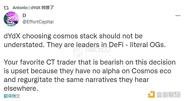 加密分析師 @EffortCapital 表示,dYdX 作為 DeFi OG 選擇 Cosmos 這一事件的影響不應低估。其他加密 KOL 對這個決策不看好是因為他們并不了解 Cosmos 生態。
