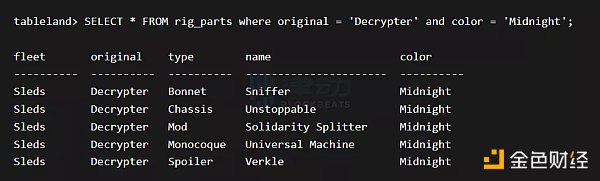 通過SQL查詢指令及其得到的結果,我們能看出顏色為「Midnight」的「Decrypter」部件是「Sleds」鉆機的專屬。元數據的可視性更強,更加易讀
