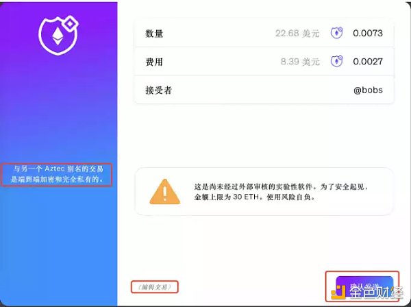 接受者可以填寫用戶名或者以太坊地址都可以。然后注意黃色的警告,軟件尚未審計,金額上限為 30 ETH,風險自擔。