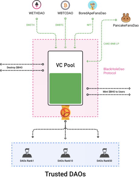 BHDP 是 BlackHole DAO Protocol 協議的全名稱,從上述圖可以看出,協議是由一個國庫來支撐,其中智能合約銜接了 VC Pool 和 Donation Pool,VC Pool 支持多資產憑證來投資,其中一部分用于銷毀流動性池中的 BHO,另外一部分用于 DAOs 投資成功之后的信用貸,而 Donation Pool 接受投資機構、DAOs 團隊即個人 BUSD 直接投資,最終按 BUSD 進行回報,其中 Transaction tax pool 支撐了 Donation Pool、DAOs 社區、Black Hole Reactor 等運作。