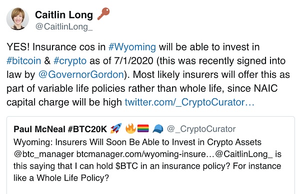 懷俄明州政區塊鏈工作組負責人Caitlin Long在Twitter上確認,由于通過的新法律,該州的保險公司從2020年7月1日開始將可以投資比特幣和加密貨幣,由于全美保險監督管協會(NAIC)的資本支出很高,保險公司很可能會將加密貨幣作為可變壽險保單的一部分。