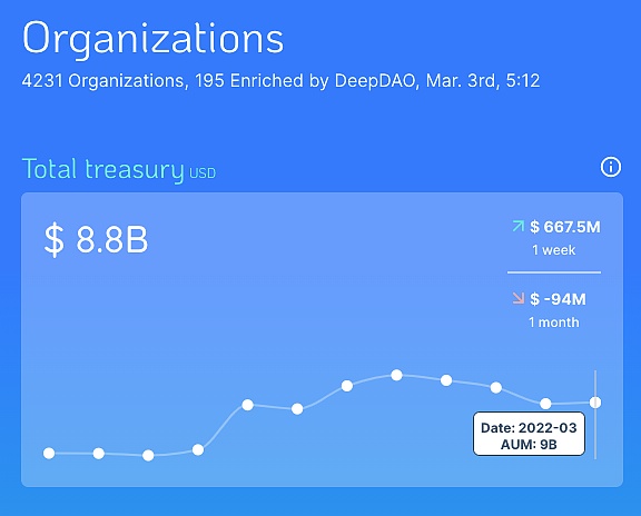DAO的治理模式雖然還在萌芽階段,難以直接類比傳統公司的資產量級,然而根據DeepDAO的數據顯示,當前4000多個DAOs的Tresury(未計NFT資產)合計有接近90億美金的市場價值,而且不同DAO的AUM(資產管理規模)有著巨大的落差,當前多數DAO的AUM落在1億美元以下,僅有16個DAO組有超過一億美元的資產,DAO的蓬勃發展潛力,以及DAO之間資產規模的落差足以構成借方和貸方的強烈供需。