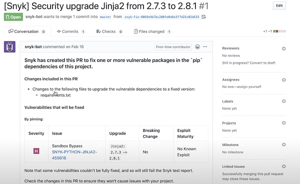 接著,Snyk 會自動觸發最利于漏洞修補的 Pull Request,進行一定規模內的安全性能升級,或者通過專有的精確性補丁(Precision Patches)的形式減少變動;