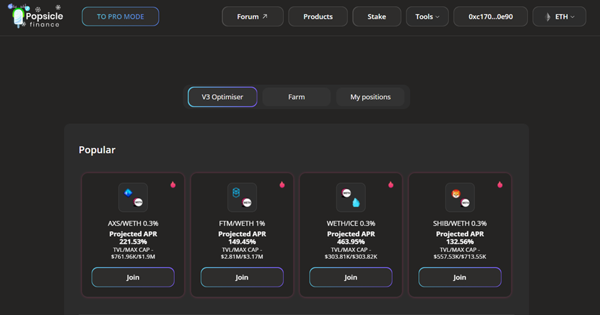 V3優化器Sorbetto Fragola ——主要針對Uniswap V3流動性提供者開發的產品,解決了用戶需要自己根據收益率策略設置、選擇LP價格范圍的問題。用戶只需選擇把LP資金存放在Fragola上,該工具會根據資產歷史波動情況,優化LP的價格范圍,設置策略,對LP資金收益率進行調倉,簡化了用戶調倉的動作,節省GAS費的同時,獲得最優收益率。此外,用戶在Fragola存入LP資產后,會收到一個PLP憑證,該憑證就是用戶在Popsicle應用的倉位情況。