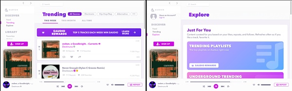 Audius應用包含網頁端、桌面端和移動端。以桌面端為例,用戶在注冊登錄前即可瀏覽高熱的單曲和播放列表,并即刻收聽音樂,使用便利。