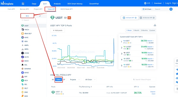 由于該頁面數據較多,以PC端打開為例,進入官網后,點擊DeFi—Token APY—單幣,下方的 USDT ALL POOLS APY,選擇 [Token]即單幣質押選項。可見詳細的礦池列表。折線圖圖表區是