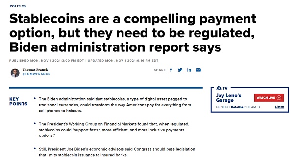 2021年11月1日,拜登政府的金融工作小組發布了關于穩定幣的報告,認為穩定幣是一種競爭性的支付手段,但必須被監管,拜登的經濟顧問也一再催促國會通過關于穩定幣的法律框架,該框架將會首先把中心化的穩定幣如USDT、USDC和BUSD等納入監管范圍,對其進行類銀行的監管。