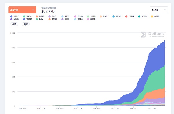 近幾年來,穩定幣市場的規模呈現爆炸式發展,根據Debank數據統計,2020年11月穩定幣市場規模同比增長441%,而2021年穩定幣市場規模同比增長445%,考慮到Debank的數據尚未收錄Terra等新公鏈以及MIM等新興穩定幣的數據,實際2021年的穩定幣市場規模增速應在500%以上。