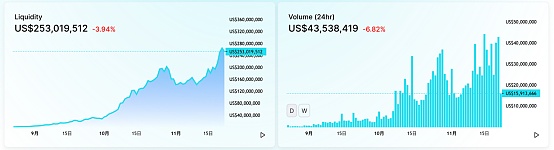 Defi Kingdoms平臺總流動性達253,019,512美元,日交易額43,538,419美元,過去三個月總體上也是一直保持超高速上漲,平臺流動性排名前三的token為別是Jewels(平臺Token)、ONE(Harmony鏈幣)以及ETH。