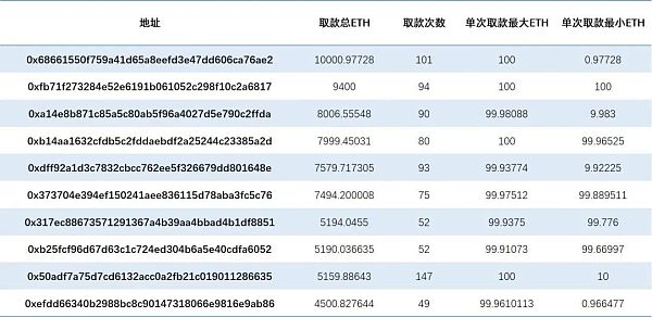 對所有交易進行存款、提款歸類后,統計了每個地址存/提款總額(單位 ETH) 、次數、最大存/提款金額、最小存/提款金額統計。得到了 22714 個存款地址,31737 個提款地址,其中存/提款總額 Top 10 數據如下: