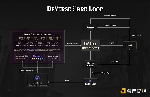 DeVerse白皮書露出了游戲內的經濟循環圖,展現如何邊玩邊賺錢。簡單來說,你可以通過戰斗來獲得DVT獎勵以及寶箱碎片。寶箱碎片合成寶箱后,可以隨機獲得守護神、造物和升級材料,幫助你進行守護神的加強升級,在戰斗中獲得更多獎勵。同時如果你是游戲老手,你也可以去爭奪雙周排行榜的DVT獎勵。