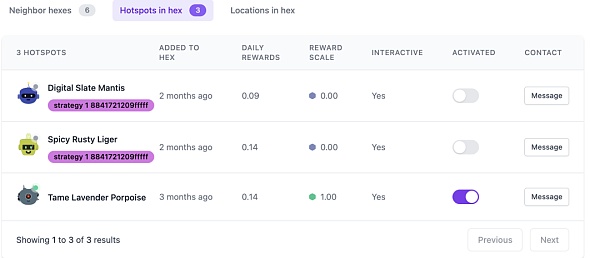 閱讀頁面上的信息告訴我們,結合了周圍的情況后,在這個大的H8解析度的橙色六邊形中,目前熱點數量比預期的熱點數量多出了2臺,所以導致這個橙色六邊形中所有的熱點獎勵系數較低(3臺均為0.33)。