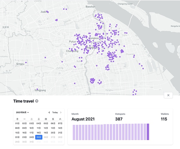 Hotspotty上還有一個好玩又實用的功能,比如Time Travel (時間穿越)。在首頁上點擊右下角的Time Travel按鈕,你就可以看到區域內的熱點與錢包地址數量的歷史記錄。