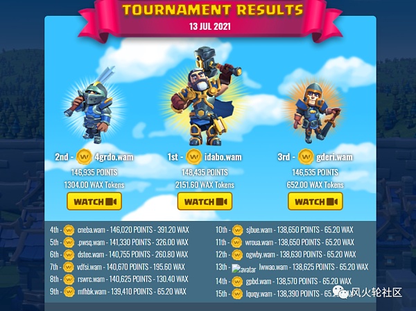排名賽每次門票需要10wax,每天(按UTC時間)按玩家獲得的積分排名,下圖是塔防13號的排名,第一名的分潤是2151wax還算可觀:
