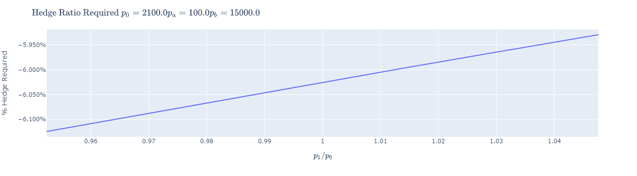 以保護市場的盈利功能來說,你需要為你的每一個單位的頭寸購買0.05個單位的保險。作為理智的檢查,考慮另一個更寬的LP范圍,在這個范圍內,你將面臨明顯更多的無常損失:假設范圍為[100,15000],那么在相同的初始價格下,需要以下對沖比率: