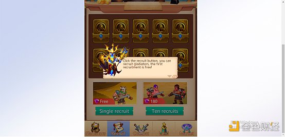 游戲初始為了玩家可以體驗游戲,會有三次免費的抽取角斗士的機會。首先,根據游戲提示,點擊左下角菜單欄中的[Recruit]