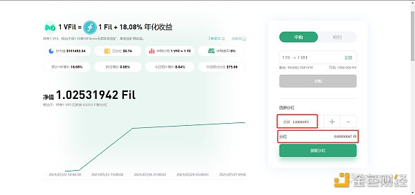 連接錢包之后,就能看到以下頁面。頁面右側是申購區域,通過申購你可以獲得VFil,但是需要付出等數量的Fil。