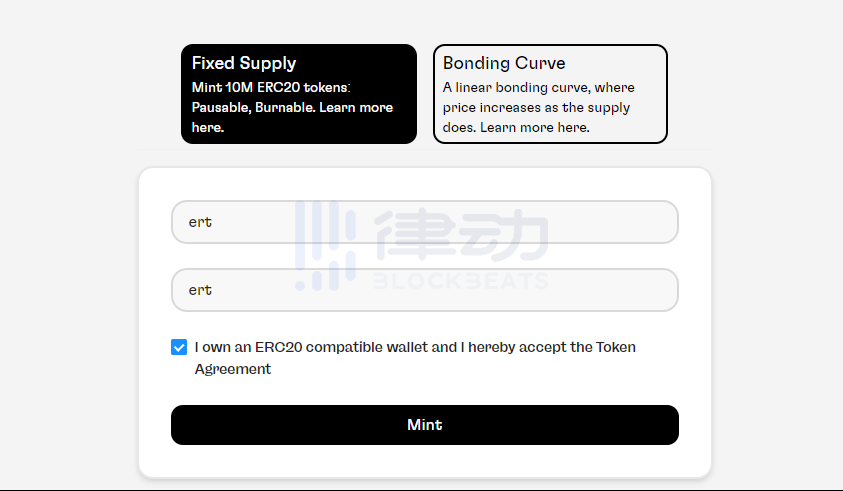 另一種則是以聯合曲線的形式發行代幣,不固定供應量,代幣價格會跟隨供應量的增長而增長,有助于獎勵代幣早期持有者,降低創作者冷啟動的阻力。同樣的輸入代幣名稱、標志和斜率(反映代幣價格變化快慢的指標),即可完成代幣的發行。