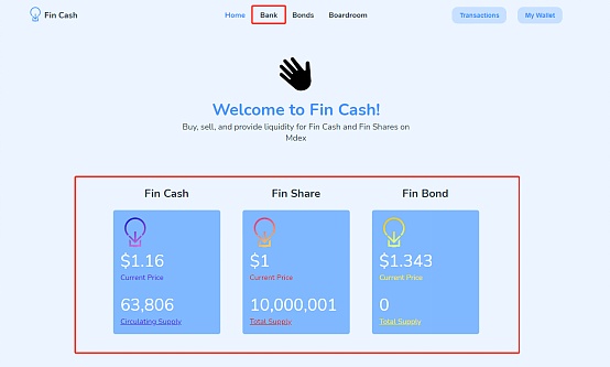 上面分別是Fin Cash、Fin Share、Fin Bond,當前價格、供應量,點擊Bank進入挖礦頁面