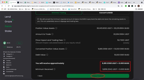開、平倉手續費及滑點則可通過操作來減小。首先需要明確一點,在Alpaca.Finance上進行穩定幣挖礦所借入的資產都是BUSD。