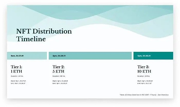 銷售期于2021年3月27日星期六上午9:00點(格林尼治標準時間-7小時)開始,到2021年3月31日星期三下午5:00點(格林尼治標準時間-7小時)結束。一次只能開放一個等級,一個等級結束和另個等級開始之間預設了休息時間。
