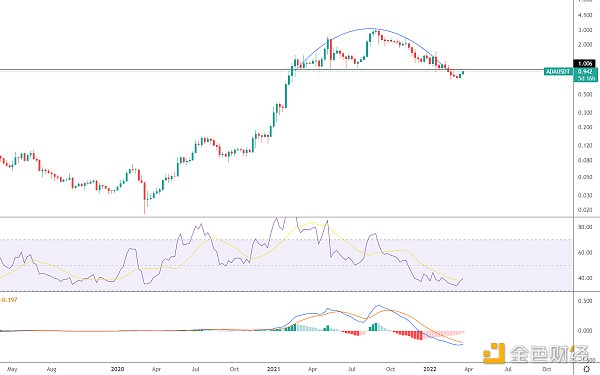 周線級別的超跌反彈,上方周線壓力1美金,周線在未有效突破前可以考慮高拋,整體仍是空頭趨勢,反彈后有再次下探風險。