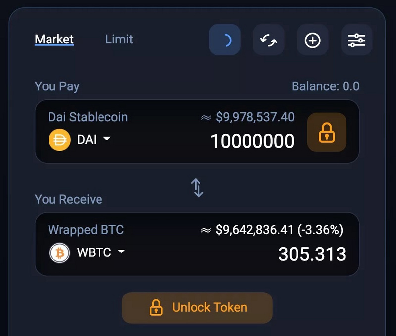 在交易聚合平臺1inch,100萬DAI能夠兌換31.47wBTC,滑點不到1%;1000萬美元DAI能換到的wBTC數量大約是305.31,滑點為3.36%%。