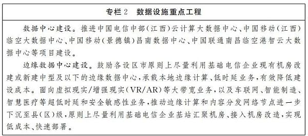 圍繞網絡設施、數據設施、智能設施、創新設施,強化重大項目的牽引與帶動作用,積極布局數據中心、國家級互聯網骨干直聯點、國際互聯網數據專用通道、工業互聯網標識解析二級節點以及AI、區塊鏈、物聯網、VR規模應用等一批重大項目,完善全省科創城布局,打造中部地區領先的新型基礎設施體系,筑牢數字江西建設底座。
