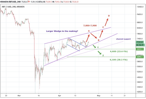下圖我們可以看到三角阻力和支撐位。7250和6600會分別是牛市和熊市的關鍵位置。