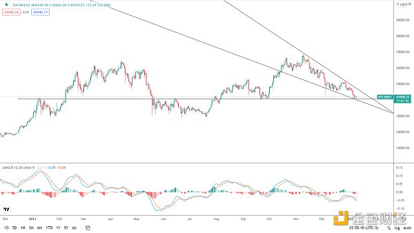 BTC下探至關鍵支撐帶39000-41000美金區域探底回升,前期該區間對BTC的趨勢壓制與支撐作用很明顯,而且高斯通道中軌線也在這一帶,歷史上BTC從高位首次回落至中軌線附近一般都會出現較大級別的反彈,并且近期BTC價格在創出12月初大跌新低后,量價和指標出現背離,再大幅度下殺的概率不大,后面BTC迎來反彈的概率大,耐心等待底部結構出現。
