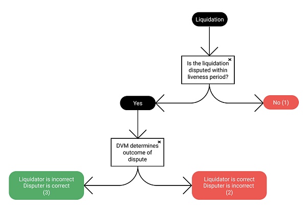 爭議者會迫使清算者保持誠實,一旦他們發現無效的清算,就會因此獲得獎勵。只有在清算引起爭議之時,才會需要預言機。如果預言機返回的價格顯示爭議者是對的,清算者就會遭到懲罰,其罰款會作為爭議者的獎勵。相反的,如果爭議者是錯的,他的保證金就會被罰沒,獎勵給清算者。