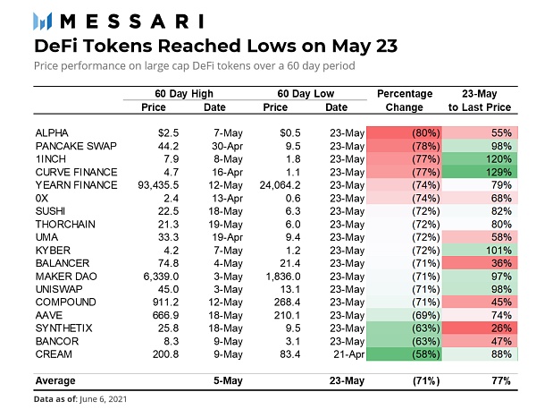 下表是過去60天的價格表現表。大多數代幣在5月5日前后幾天達到了他們的局部高點(LHs)(該組的平均值)。SUSHI、RUNE、AAVE和SNX是例外,它們在5月14日左右開始拋售后達到高點。下面主流DeFi代幣平均跌幅為-72%,60天的低點日期尤為同步——發生在5月23日。在60天內,PancakeSwap和1INCH的表現不佳,而Synthetix和Bancor表現出色。