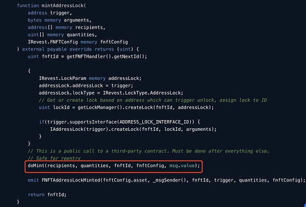 2. 接著調用 Revest 合約中的 mintAddressLock 函數,傳入 quantities 為 2,該函數進行加鎖操作后會調用 doMint 函數來鑄造 NFT