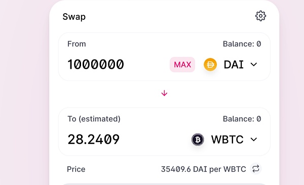 通過 Uniswap 交易100萬 DAI,購買 BTC,滑點大約為 1.5%,得到大約 28.24 ?個 wBTC ,如下: