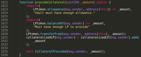 圖一:WarpVaultLP智能合約中provideCollateral()函數