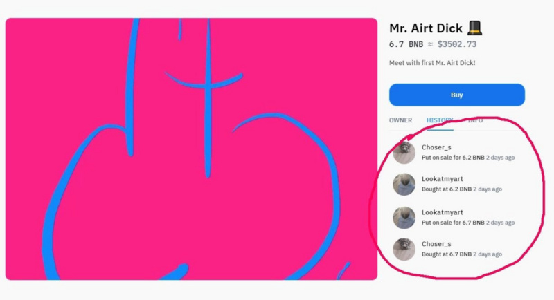 看來 B 市場給的兩周新手期在我身上已經過了,我也對 NFT 交易開始產生了一點疑慮。告別市場 B 后,我去了市場 A。這是一家三月底才剛開的市場,主打賣點就是便宜得可以忽略的鑄幣費,聲稱要成為 BSC 鏈上的 NFT一霸(結果到 6 月的時候,它的 AMA 在線咨詢會都湊不到足夠的人來參加……)。更低的鑄幣費是吸引藝術家/賣家來使用一個平臺的常用手法,此外還有給用戶空投平臺幣(基本上是很快就跌成屎的垃圾幣),抽獎等等利好活動。當然,除了這些明著玩的手法,暗著玩手法的自然也有的是,這個市場 A 就是各種手法都用上了。
