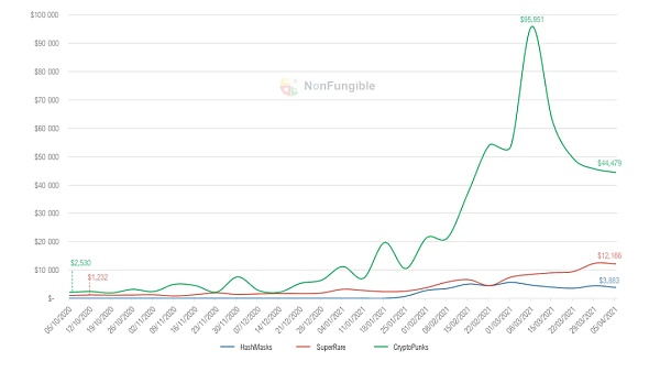 毫無疑問, CryptoPunks是近期最受關注的項目之一,CryptoPunks的平均價格在短短幾個月內從2500美元增加到95900美元,到3月底又回落到45000美元左右。