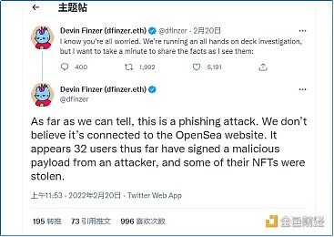 近日,OpenSea首席執行官Devin Finzer在一條推文表示:"到目前為止,有32個用戶簽署了來自攻擊者的入侵,他們的一些NFT被盜。"并暗示可能是一個欺詐性網站造成的。